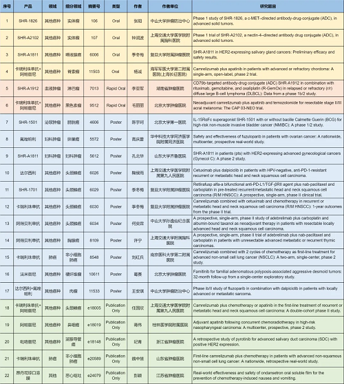 在肺癌、妇科肿瘤、淋巴瘤、膀胱癌、头颈肿瘤、黑色素瘤、肉瘤、鼻咽癌、脊索瘤、唾液腺癌、胸腺癌、硬纤维瘤、涎腺导管癌等其他多个疾病领域,卡瑞利珠单抗、阿帕替尼、阿得贝利单抗、吡咯替尼、达尔西利、氟唑帕利、法米替尼、SHR-1501、瑞拉芙普-α(SHR-1701)、SHR-1826、瑞康曲妥珠单抗(SHR-A1811)、SHR-A1912、SHR-A2102等抗肿瘤创新药相关研究一共入选了4项口头报告、2项快速口头报告、11项壁报展示和4项线上发表,彰显了AG真人平台医药强劲的研发实力。此外,昂丹司琼口溶膜在防治化疗导致的恶心呕吐方面展现出了良好的疗效,本次ASCO年会有1项研究线上发表。