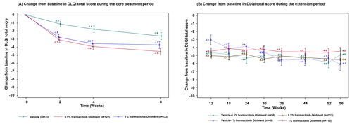 ● 0.5%和1%艾玛昔替尼软膏组第8周DLQI总分(皮肤病生活质量指数)较赋形剂组校正的LS平均变化分别为-1.9(p=0.0016)和-1.1 (p=0.0662),改善维持至52周。
